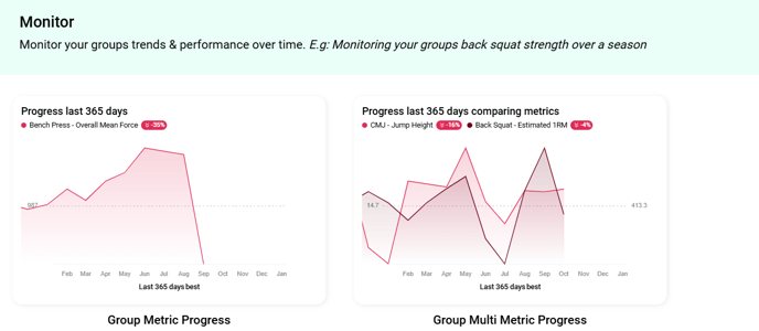 - Track the progression of a two metrics across multiple athletes in the group. You can compare the latest session data with previous performances and visualize overall growth.