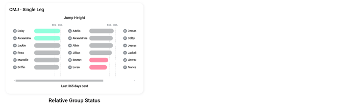 In this example, the Relative Group Status widget is set up to show if the athletes' average jump height over the last year is within two performance thresholds based on their personal best jump height: