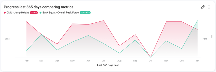 The graph below is showing two different metrics. We can see a decrease of 9% in jump height from the last year (compares the most recent measure to the the measure completed 365 days ago). However, we can see an increase of 117% in terms of the group's overall peak force for their back squats. As 'best' has been chosen here, it will show the best score achieved from the active athletes on that day.