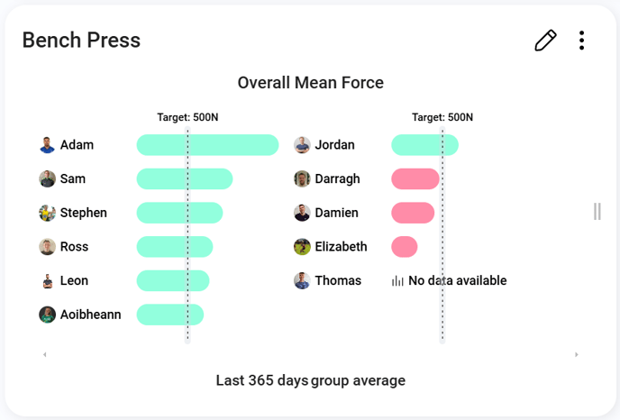 The Group Target widget is configured to track the group's progress in their average Bench Press Overall Mean Force over the past year, with a set target of 500N. The widget breaks down individual performance, showing that Adam exceeds the target with a mean force of 1366N, and Darragh is close to meeting the target at 467N. This data offers actionable insights, such as focusing on athletes like Elizabeth to help them close the gap, while also recognizing top performers like Sam and Stephen.