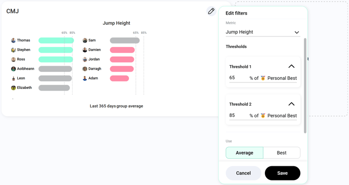 ), you can adjust the thresholds to better reflect their training goals or focus on other metrics. You also have the flexibility to set a minimum of one threshold and a maximum of two thresholds. For example, if you want to analyse if the athlete's are reaching 90% of their personal best in weight lifted on the Bench Press over the last 7 days, you can reconfigure the widget in just a few clicks.