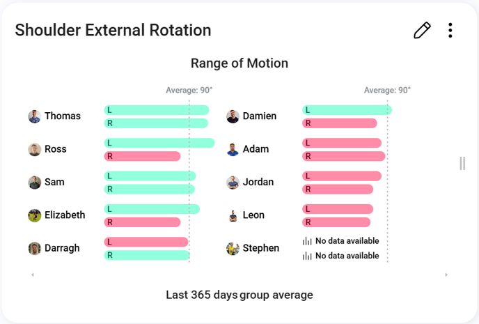 This example offers a clear and concise way to identify discrepancies in range of motion compared to a groups average, allowing coaches to prioritize interventions. Using the pencil icon (