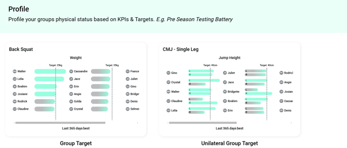 Profile your groups physical status based on KPIs & Targets. E.g. Pre Season Testing Battery. By establishing clear goals and tracking advancements through various KPIs, you can gain valuable insights into your group and each athlete's performance. Whether your focus is on achieving personal bests or developing long-term strength, you will have the necessary data to quickly determine the current status of your group and how close they are to reaching the goals you have established.