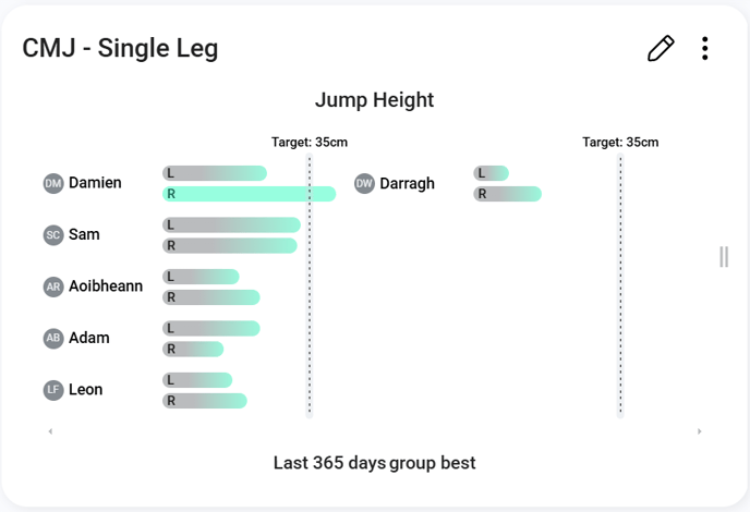 The Unilateral Group Target widget is configured to track the group's progress in their best CMJ - Single-Leg Jump Height over the past year, with a set target of 35cm. This widget provides a breakdown of each athlete's best scores for both the left and right legs, highlighting their progress toward the goal. For example, Damien has achieved 24.7cm on the left leg and 41cm on the right leg, showing a slight imbalance but meeting the target on the right side.