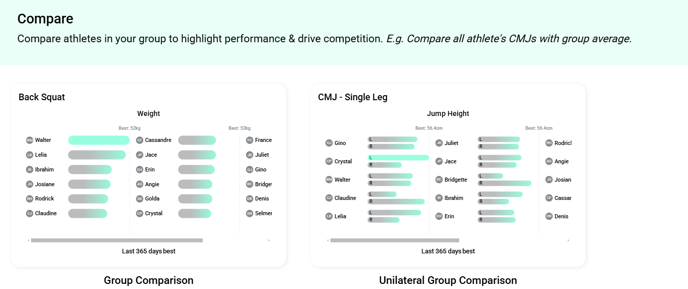 Compare your athlete's to a group to highlight performance & drive competition. E.g. Compare all athlete's CMJs with the group average.