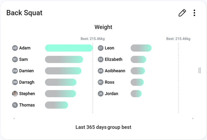 This visualization makes it easy to identify how each athlete stacks up relative to the top performer. It also serves to foster healthy competition, as athletes can see exactly how much more they need to lift to close the gap. Using the pencil icon (
